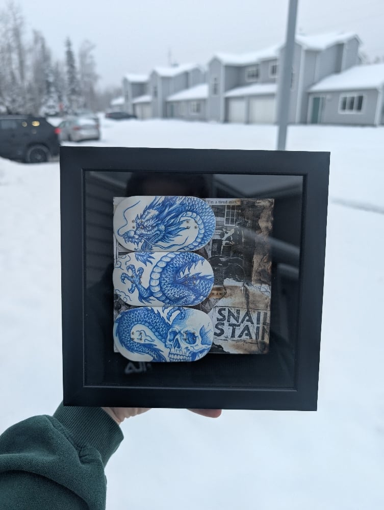 3 50mm Holy Grail decks with an illustration by SnailStain. The artwork is made with a single colored pencil.