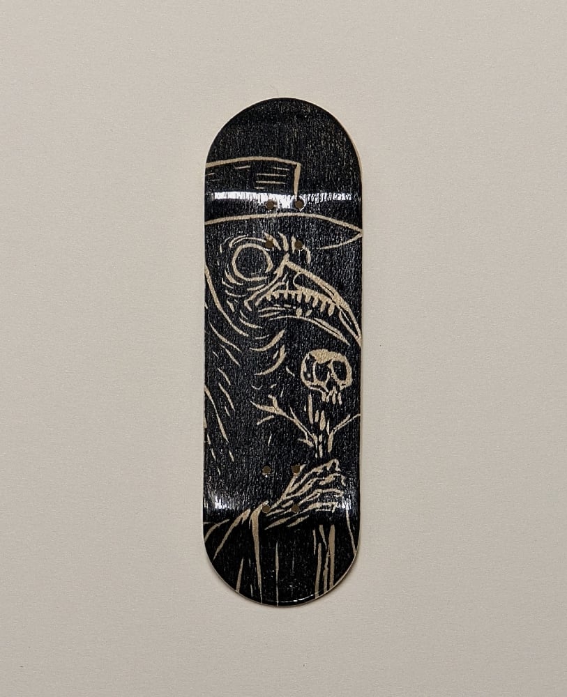 The graphic is applied by linocut and each deck is unique. By purchasing this product you will receive the deck in the photo.