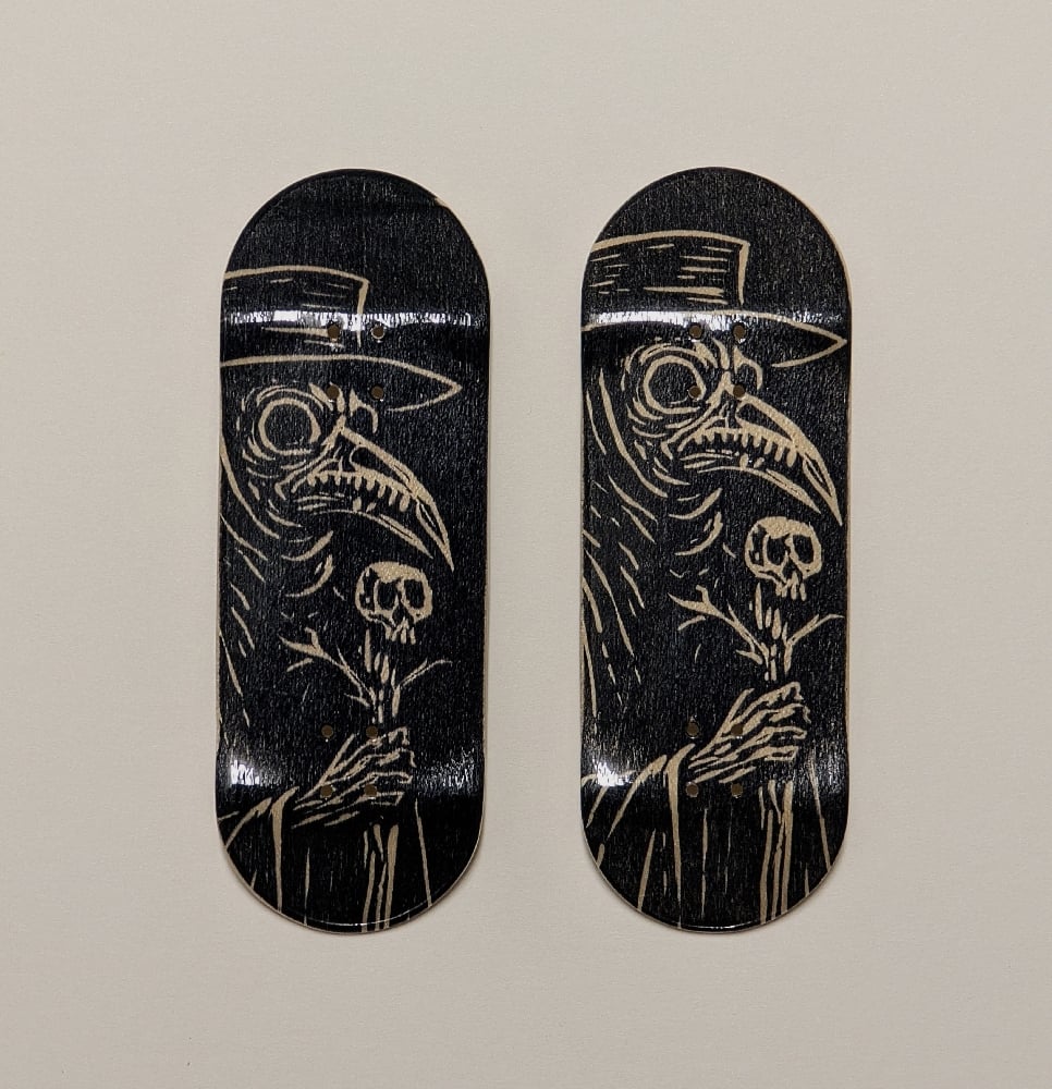The graphic is applied by linocut and each deck is unique. By purchasing this product you will receive one of the decks in the photo.
